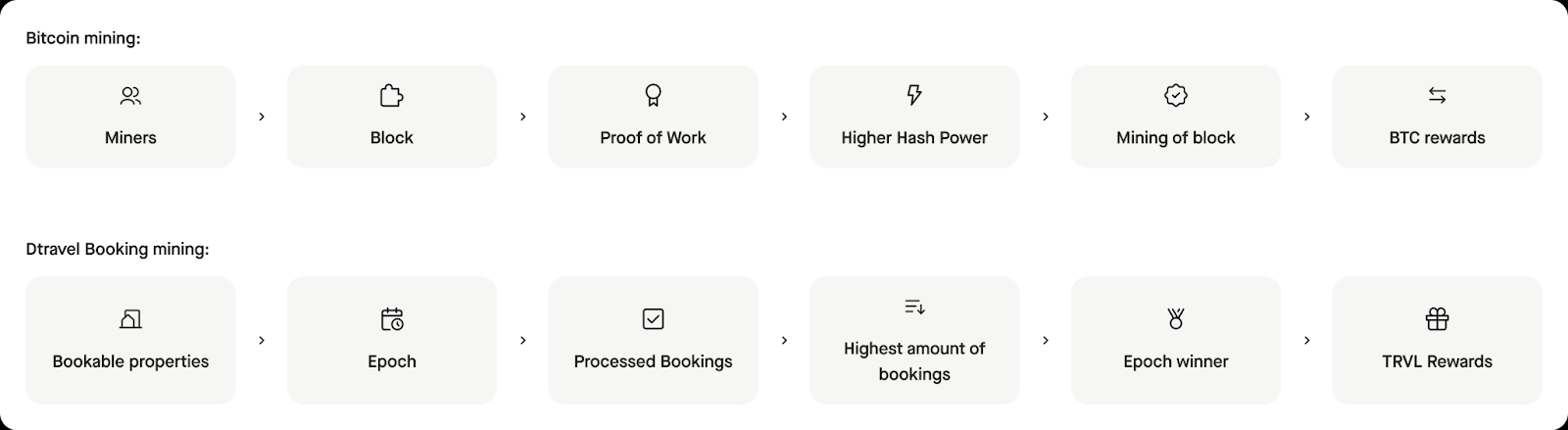 The booking mining incentives system is based on the idea that running a Dtravel-powered property is, in specific ways, like running a blockchain mining node. Processing bookings mirrors validating blockchain transactions and producing blocks.&#x20;